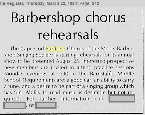 Throughout the 1980s, the Surftones continued to thrive. They performed chapter shows at various venues, including Sandwich High School and a fourth annual show at Mattacheese Middle School in 1981. In 1982 the renowned Boston Common quartet was the guest quartet!. In 1985, the chorus celebrated another milestone as it hosted the International Champion quartet, the Happiness Emporium. By then, tickets were increased to $6. Ted Myers became the Musical director.