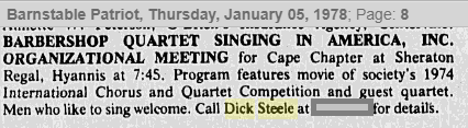 Meetings were on Mondays at Barnstable Middle School (now Barnstable Intermediate School) on Route 28 in Hyannis. Under the direction of Dick Steele, the chorus had clearly already been "making waves" for a while in the local community. That year, it held its second annual show with ticket prices of $4, for a show with four quartets, and 45 chorus members,