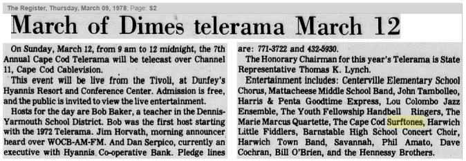 The first documented mention of the Surftones performing appears in March of 1978, suggesting that the group had already been rehearsing and performing for some time. By 1979, the chorus had officially "chartered." NED president Ron Menard presented the chapter charter in March of 1979, at an open house that filled the rehearsal space at Barnstable Middle School. The female Harmony, Inc. chorus called the Cape Cod Chordaires and two quartets also celebrated and entertained at the presentation.